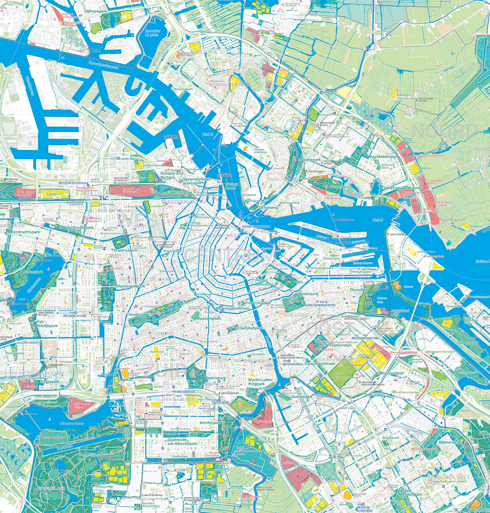 The green and blue map shows the outdoor spaces of Amsterdam: its parks, gardens, allotments, natural playgrounds, canals, lakes, forests and polders.